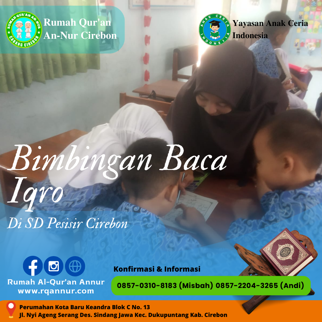 Bismilillahirohmannirohim,,,, Assalamualikum wr,wb sahabat An-Nur Ceria para pecinta al-qur’an.. Al-Hmadulillah pada hari kamis, 19 Januari 2023 Guru-guru Rumah Qur’an An-Nur kembali memberikan pembelajaran Al-Qur’an di SD Pesisir Baru Cirebon. alhamdulillah anak-anak di SD Pesisir Baru selalu semangat untuk belajar al-qur’an bersama kaka-kaka RQ An-Nur. selain belajar membaca iqro anak-anak juga di bimbing untuk belajar tahsin… Continue reading Bimbingan Belajar Al-Qur’an di SD Pesisir Baru Cirebon