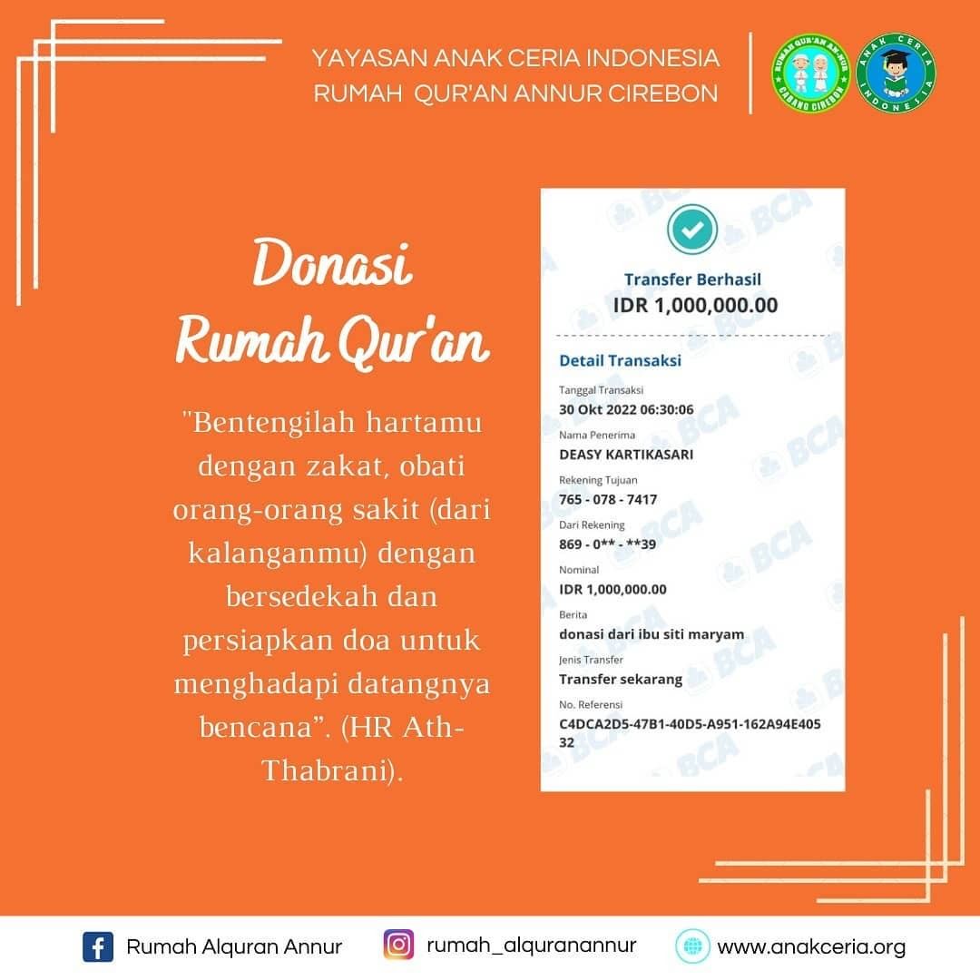 Terima kasih kami ucapkan kepada donatur yang telah menginfakan hartanya di jalan Allah untuk membantu dalam program kegiatan Rumah Qur'an An-Nur,Semoga Allah Subhana Wa Taala menggantinya dengan berlipat ganda. Menjadi amal yang tiada putus di dunia dan akhirat. Aamiin